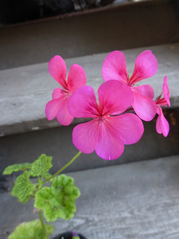 Rosarote einfache Blüten, grünes Blatt mit cremefarbigen Blattnerven.