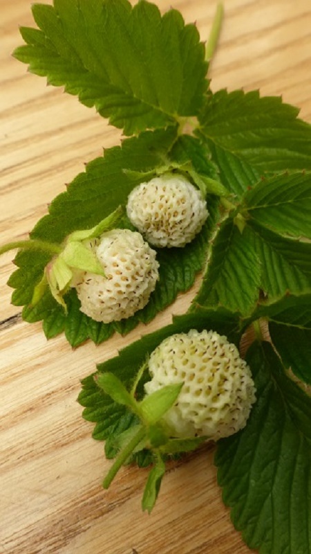 Weiße längliche Früchte mit aromatischem Waldbeergeschmack. Immertragend ,
