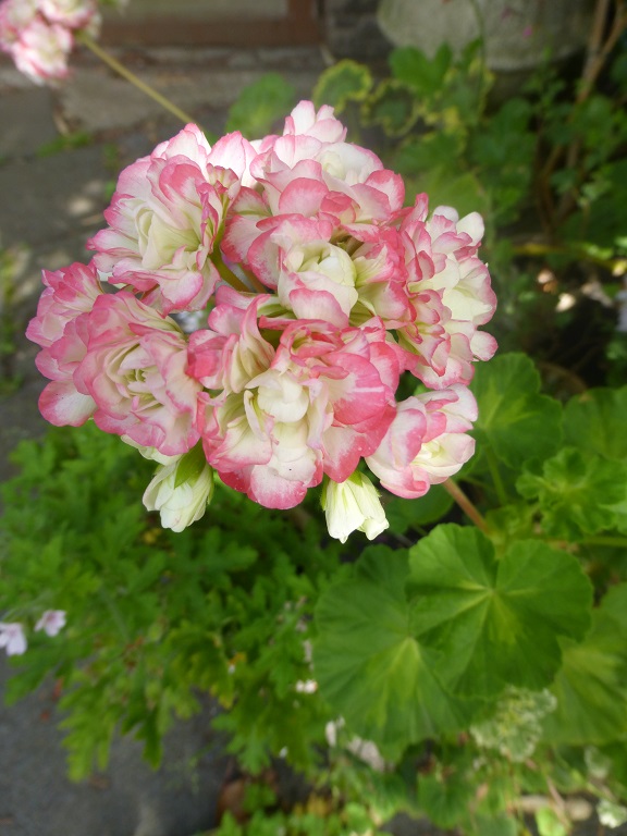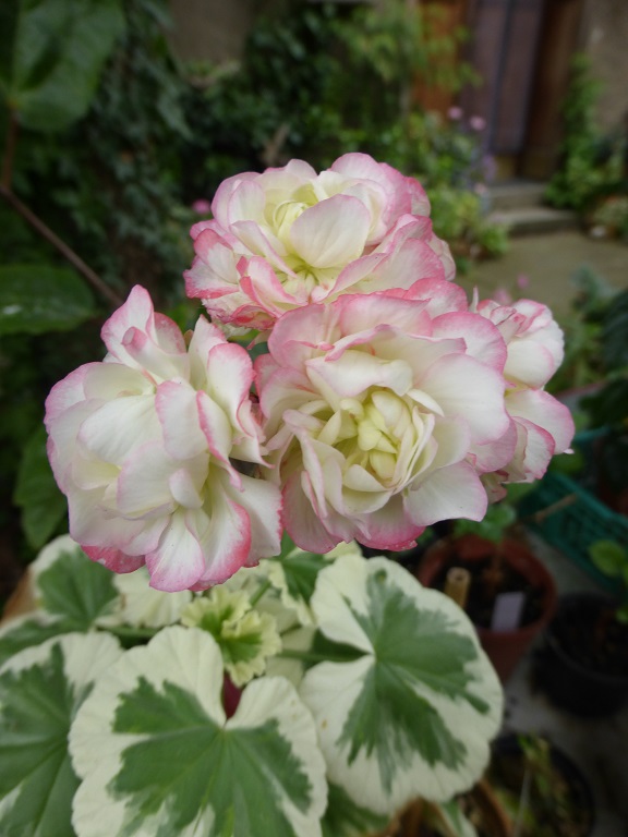 Dicht gefüllte weiße Blüten mit rosa Rand; aufrecht.
