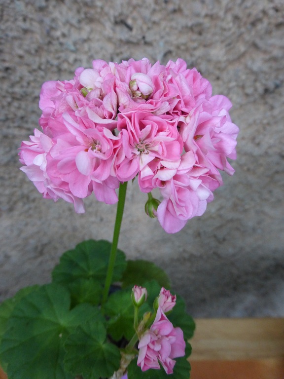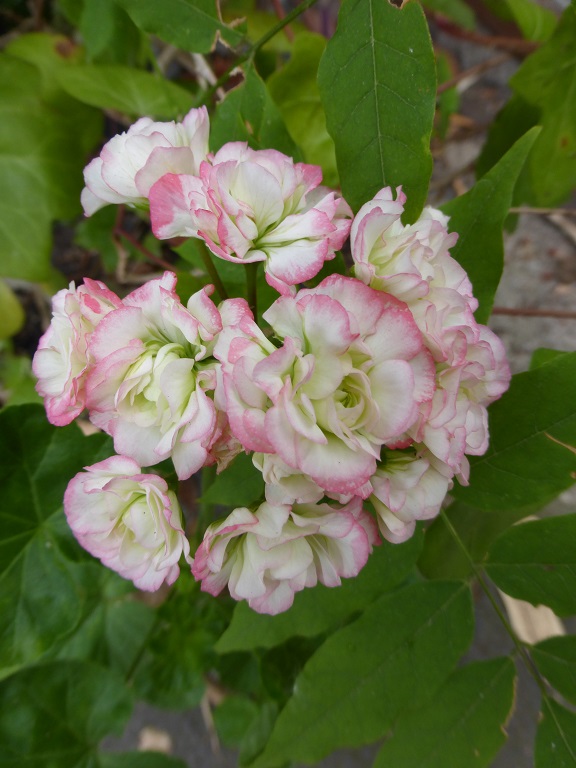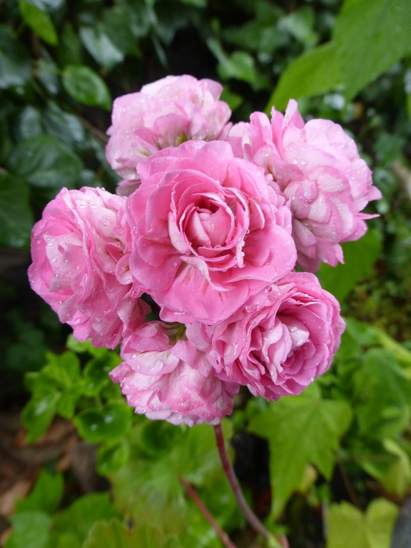 Sehr dicht gefüllte hellrosa Blüten, hängender Wuchs, efeublättrig.