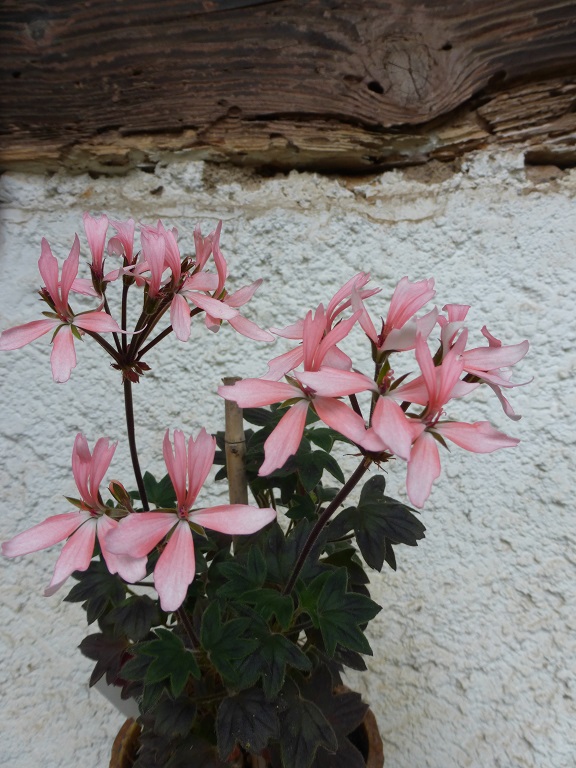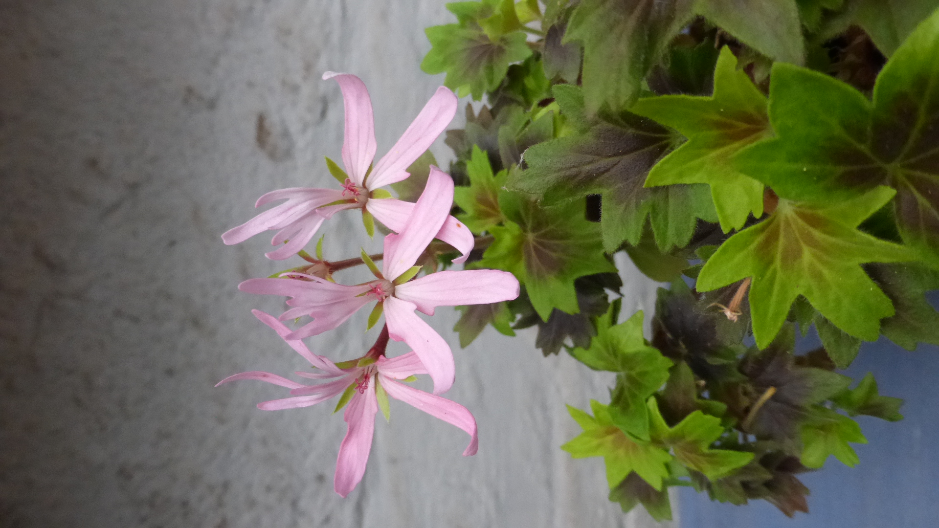 Lachsrosa Blüten, dunkelgrüne gezackte Blätter mit schwarzer