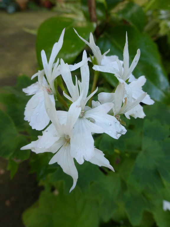 P-0241 Vectis Starbright Große weiße Blüten, stark rot gespritzt, goldenes Laub, zwergwüchsig.