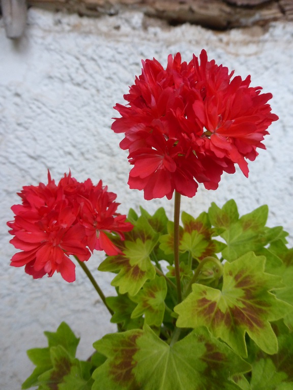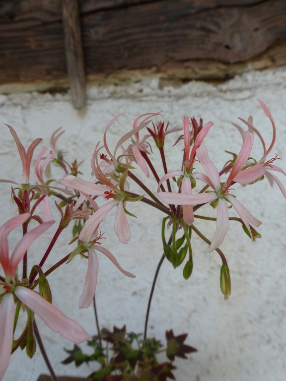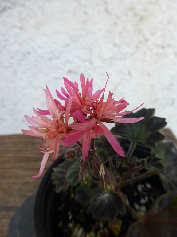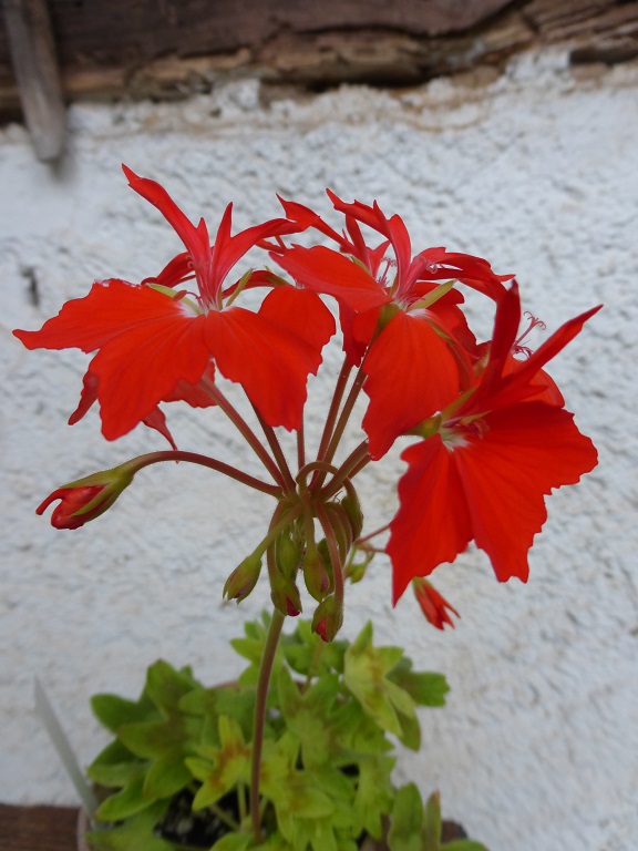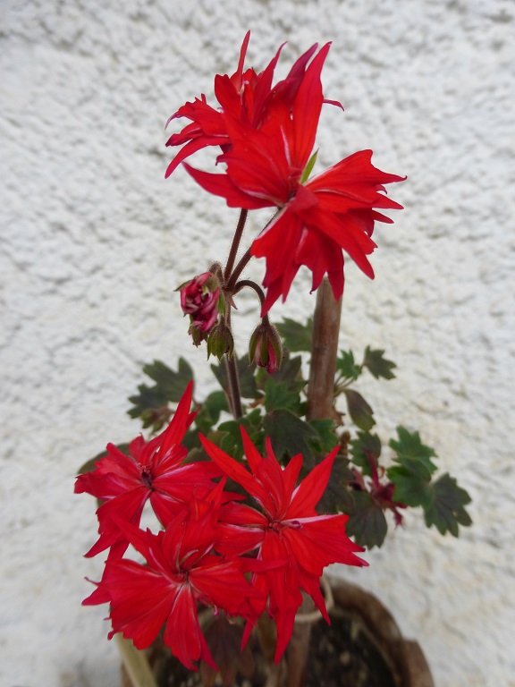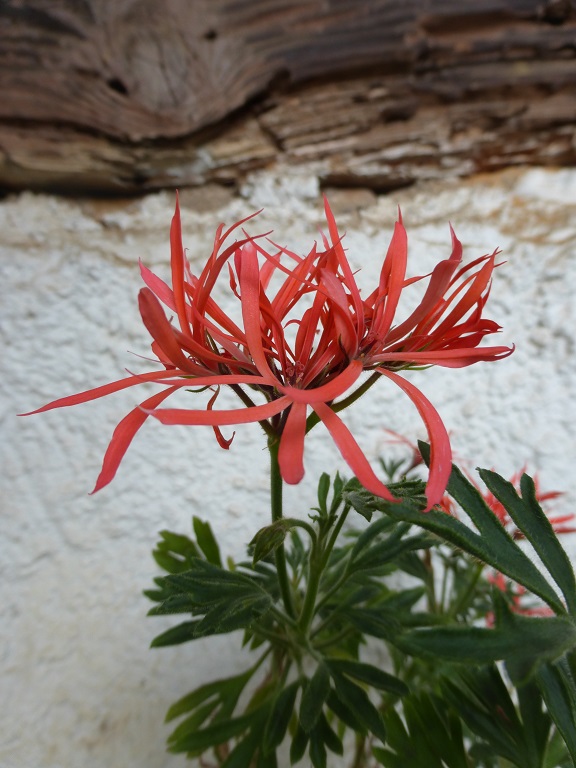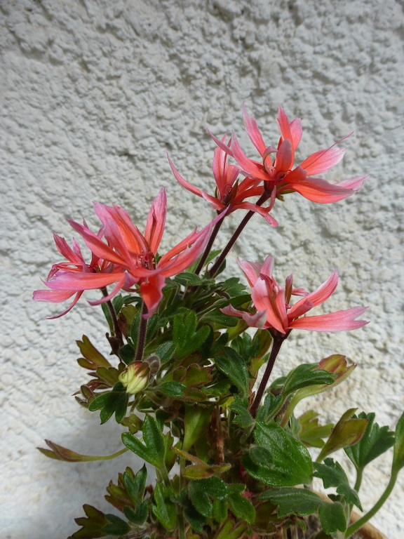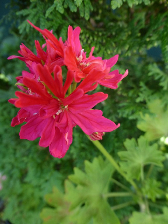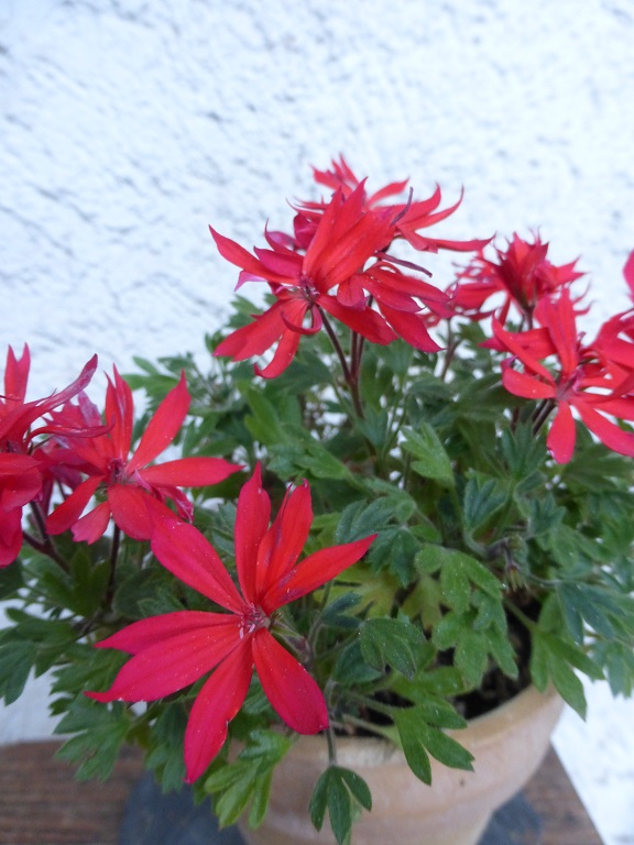 Rote Blüten, stark geschlitztes Laub, zwergwüchsig.