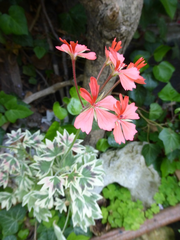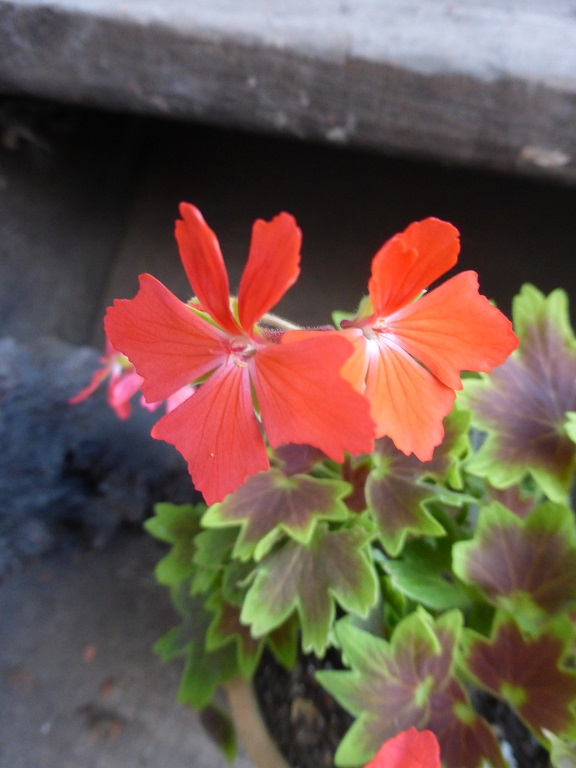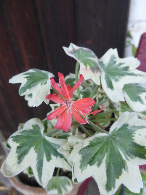 Dreifarbiges Blatt, einfache lachsrote Blüte, zwergwüchsig.