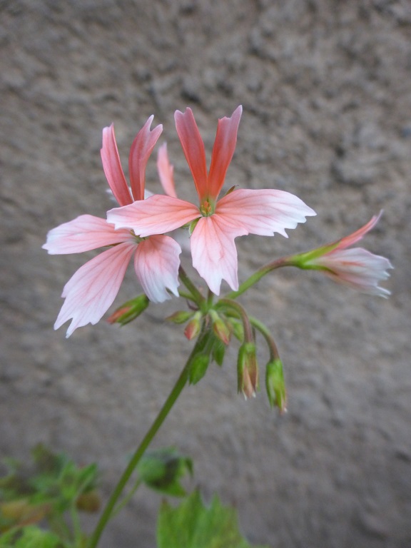 Lachsfarbene einfache Blüten, Blatt mit dunkler Zeichnung,