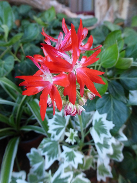 Rote Blüten, grüne Blätter mit weißem Rand, zwergwüchsig.