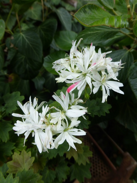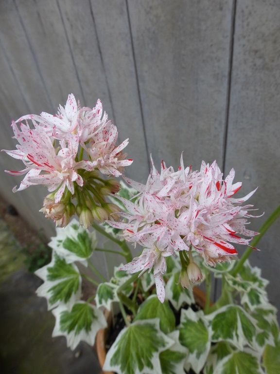 Weiße gefüllte Blüten mit roten Spritzern, graugrünes Laub mit weißem Rand,